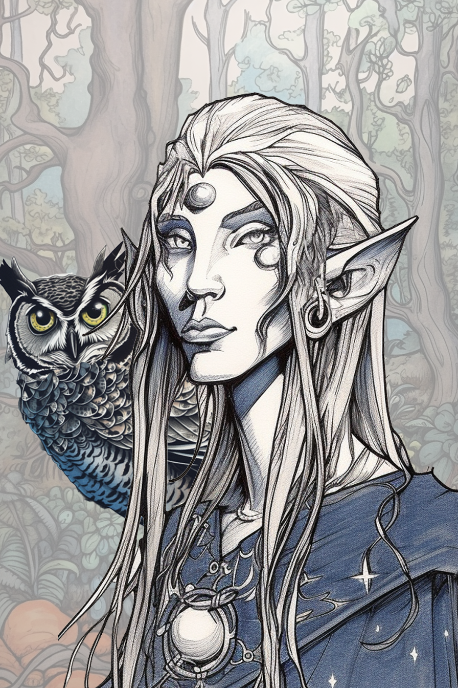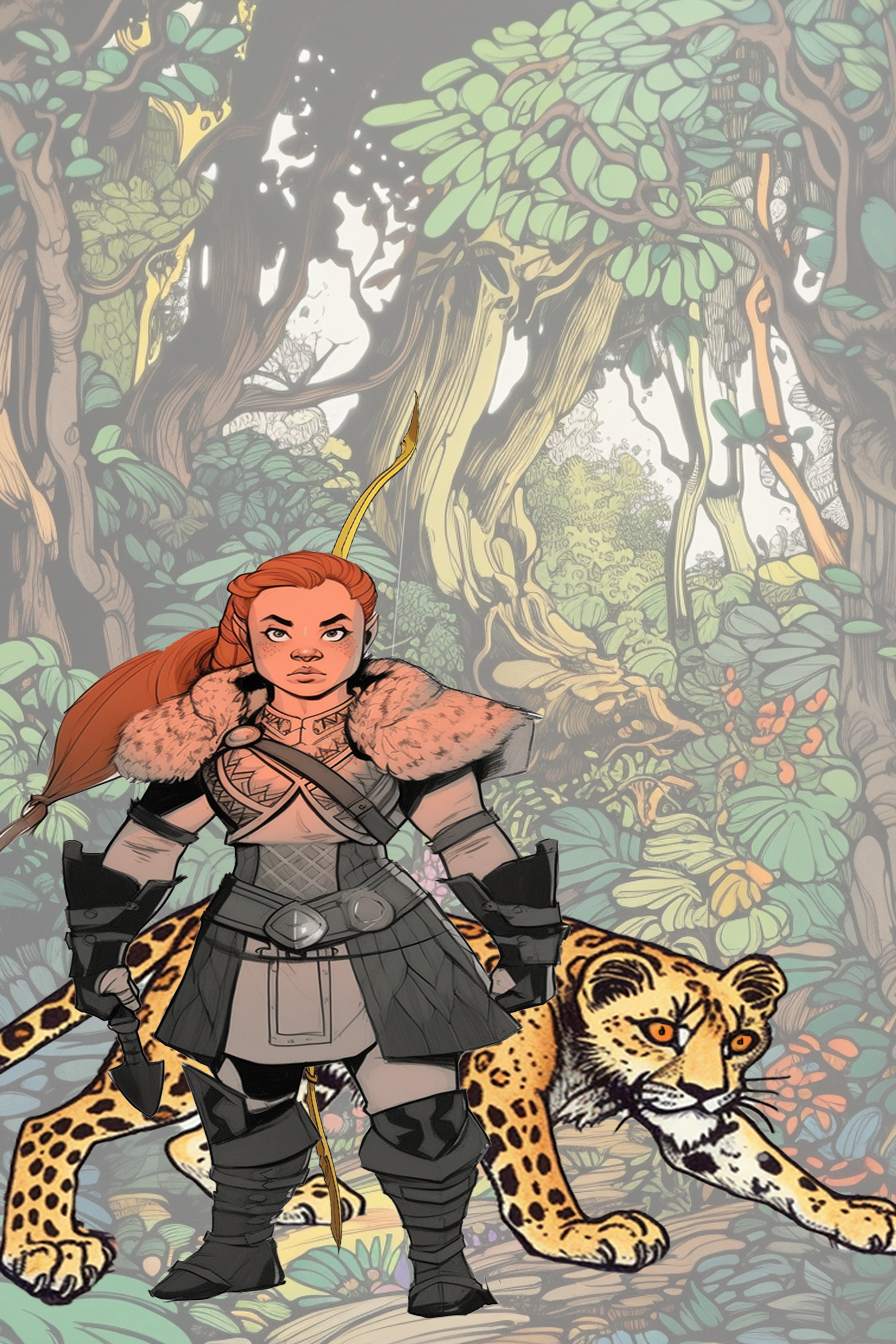 I recorded a video today of my wife’s first tiny taste of Dungeons and Dragons. Here are the (AI-generated) represenations of the pre-rolled character options I presented: an elven enchanter with an owl familiar, a human barbarian, a fire genasi Oath of Ancients paladin, and a dwarf beast master with a jaguar pet.